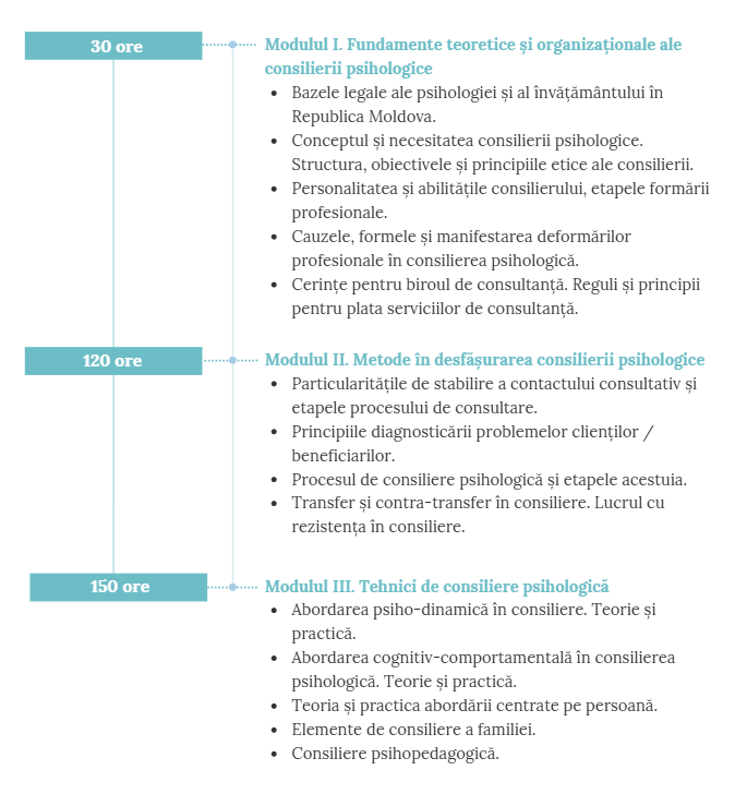 La finalizarea studiilor se eliberează certificat de perfecționare în Consiliere psihologică.